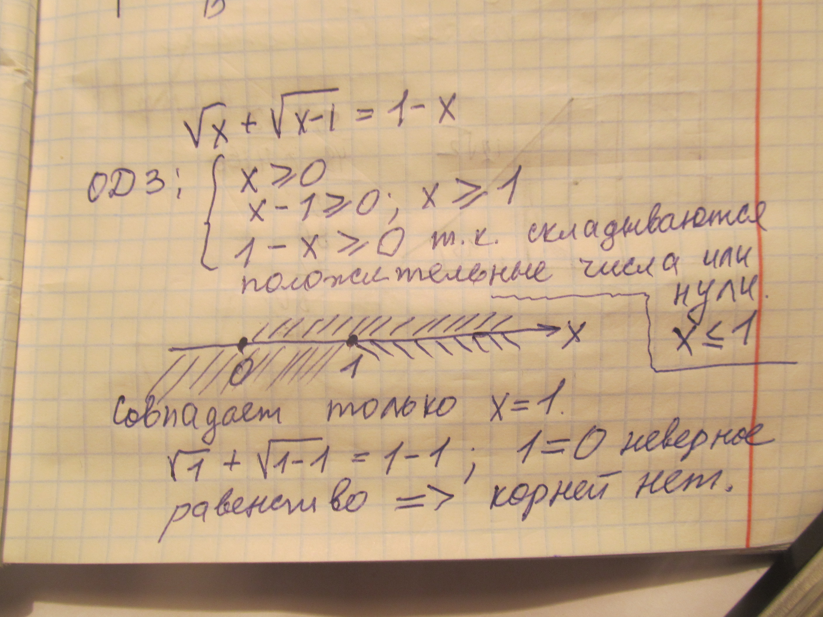 Объясните, почему уравнение корень квадратный х+корень квадратный х-1=1-х не имеет решения