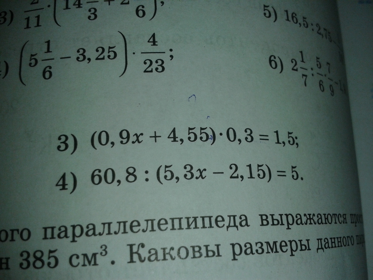 (0,9Х+4,55)=1,5:0,3 0,9Х+4,55=5 0,9Х=5-4,55 0,9Х=0,45 Х=0,45:0,9 Х=0,5