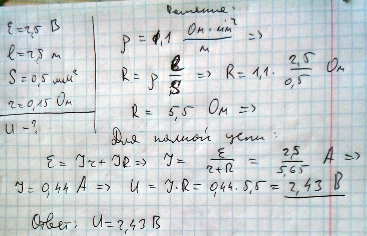 Источник электрической энергии с эдс 2,5в замкнут нихромовым проводником длиной 250см и площадь пореречного сечения 0,50мм в квадрате. определить напряжение на внешней цепи, если внутреннее сопротивление источника 0,15ом