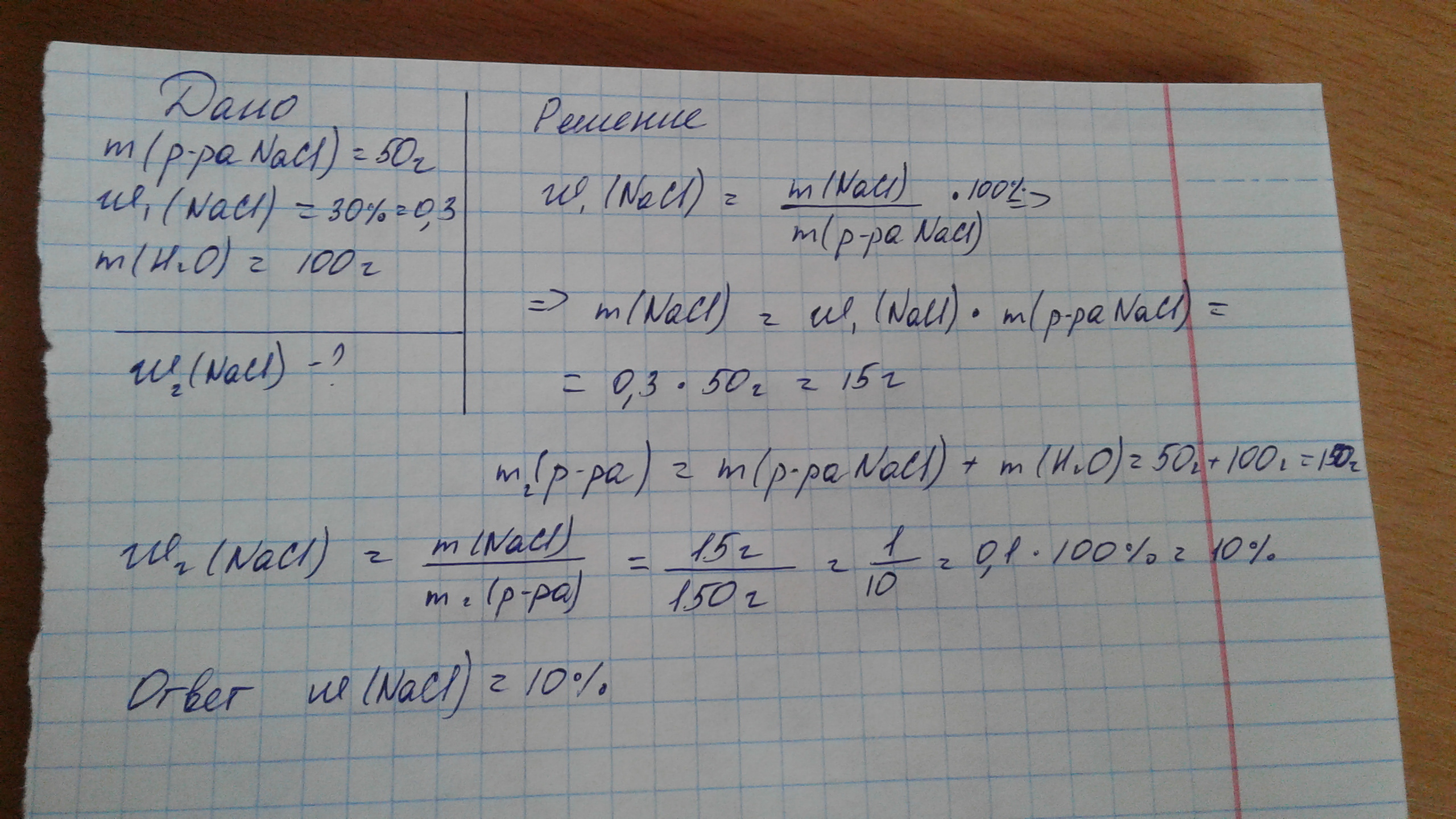К 50 г 30% ного раствора хлорида натрия добавили 100 г воды Массовая доля соли вновь полученном растворе равна ответ в процентах% помогите решить с оформление