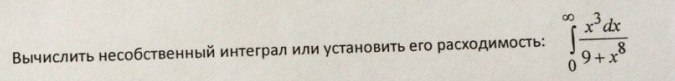 \int\limits^\infty_0\frac{x^3dx}{9+x^8}=\frac{1}{4}\int\limits^\infty_0\frac{d(x^4)}{9+x^8}=\frac{1}{4} \lim_{b \to \infty} (\frac{1}{3}arctg\frac{x^4}{3})|^b_0=\frac{1}{4} \lim_{b \to \infty}(\frac{1}{3}arctg\frac{b^4}{3})=\\=\frac{\pi}{24}