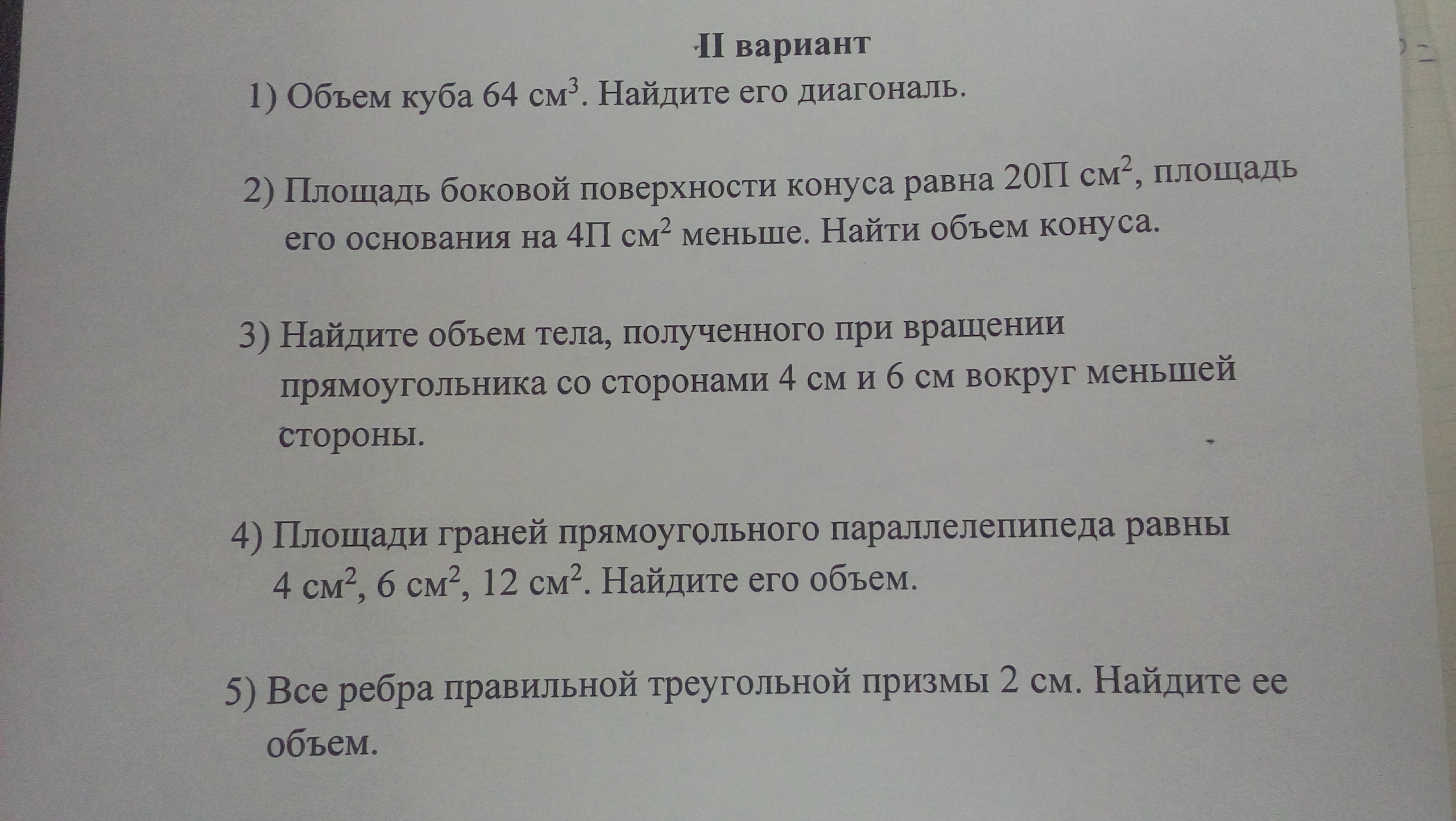 3. Прямоугольник вращается вокруг короткой стороны, значит, получается цилиндр высотой h=4 см. Радиусом основания будет другая сторона прямоугольника, т.е. R=6 см. Считаем объём цилиндра по формуле