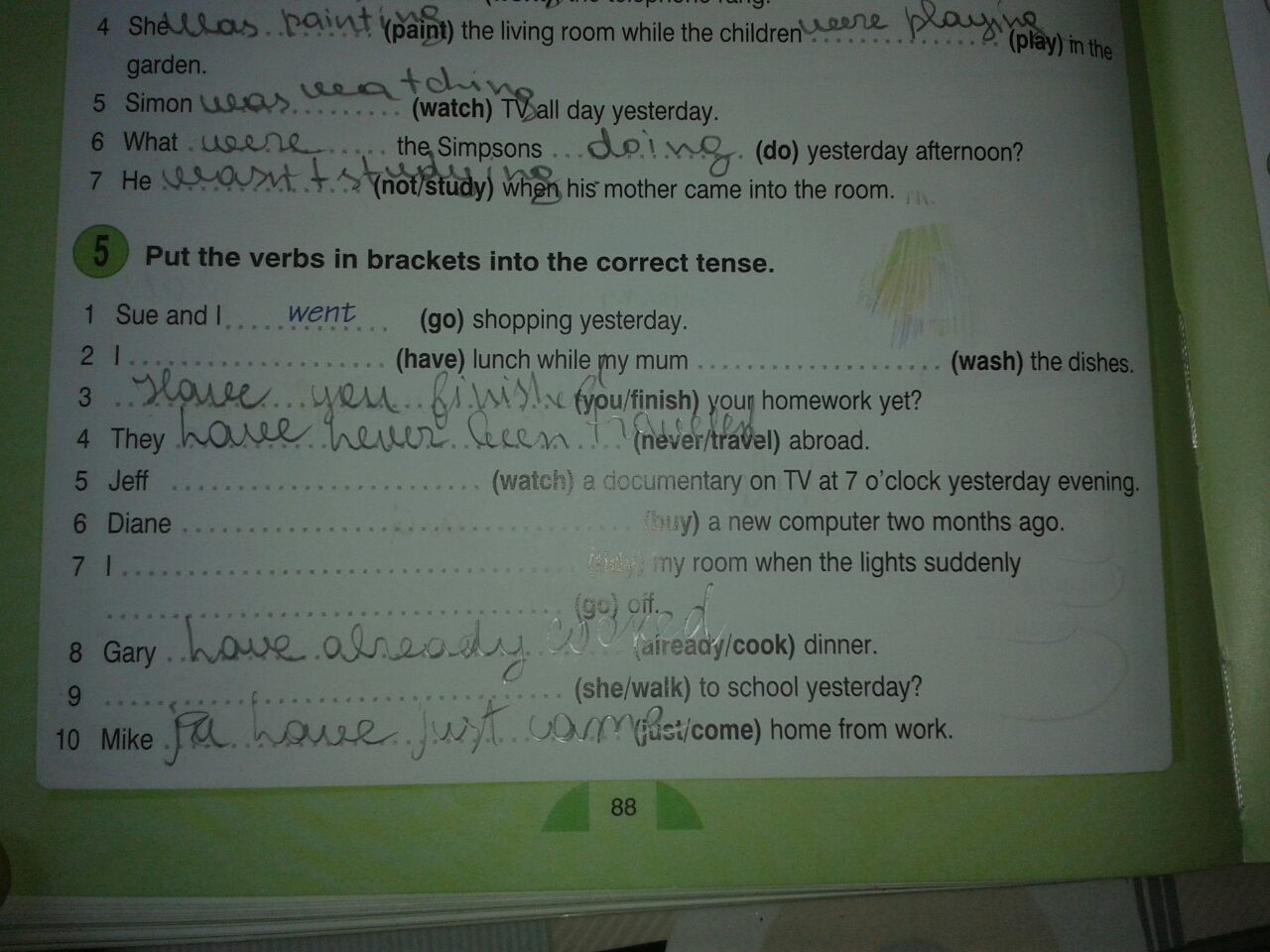 2. Am having, is washing или was having, was washing 3. Have you finished 4. Have never travelled 5. Was watching 6. Bought 7. Was tidying, went 8. Has already cooked 9. Did she walk 10. Has just come