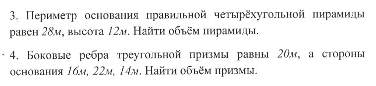 3. Так как пирамида правильная, в её основании лежит квадрат. Периметр квадрата Р=4*а, где а - сторона квадрата. Р=28 м.  а=Р/4=28/4=7 м. Sкв=a^2=7^2=49 м^2