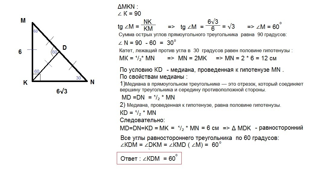 В прямоугольном треугольнике MNK угол К =90, КМ=6 см, NK= 6√ 3 см, КD-медиана. Найдите ∠ KDМ