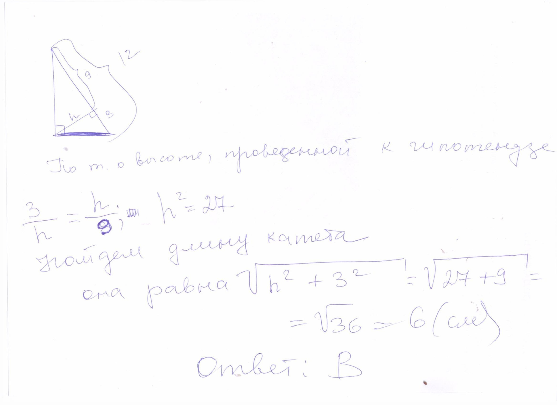 у прямокутному трикутнику гіпотенуза дорівнює 12 см.,а проекція одного з катетів на гіпотенузу-3 см.Знайдіть довжину цього катета. А)3 см. Б)4 см. В)6 см. Г)9 см.