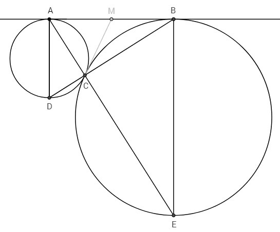 Общая касательная, проходящая через точку С, пересекает AB в точке M. Отрезки касательных к окружности, проведенных из одной точки, равны. MA=MC=MB. Если медиана треугольника равна половине стороны, к которой она проведена, то угол напротив этой стороны равен 90. ∠ACB=90. Плоский угол, опирающийся на диаметр окружности, - прямой. ∠ACD=90. ∠DCB - развернутый угол; точка С лежит на отрезке DB. Аналогично, точка С лежит на отрезке AE.