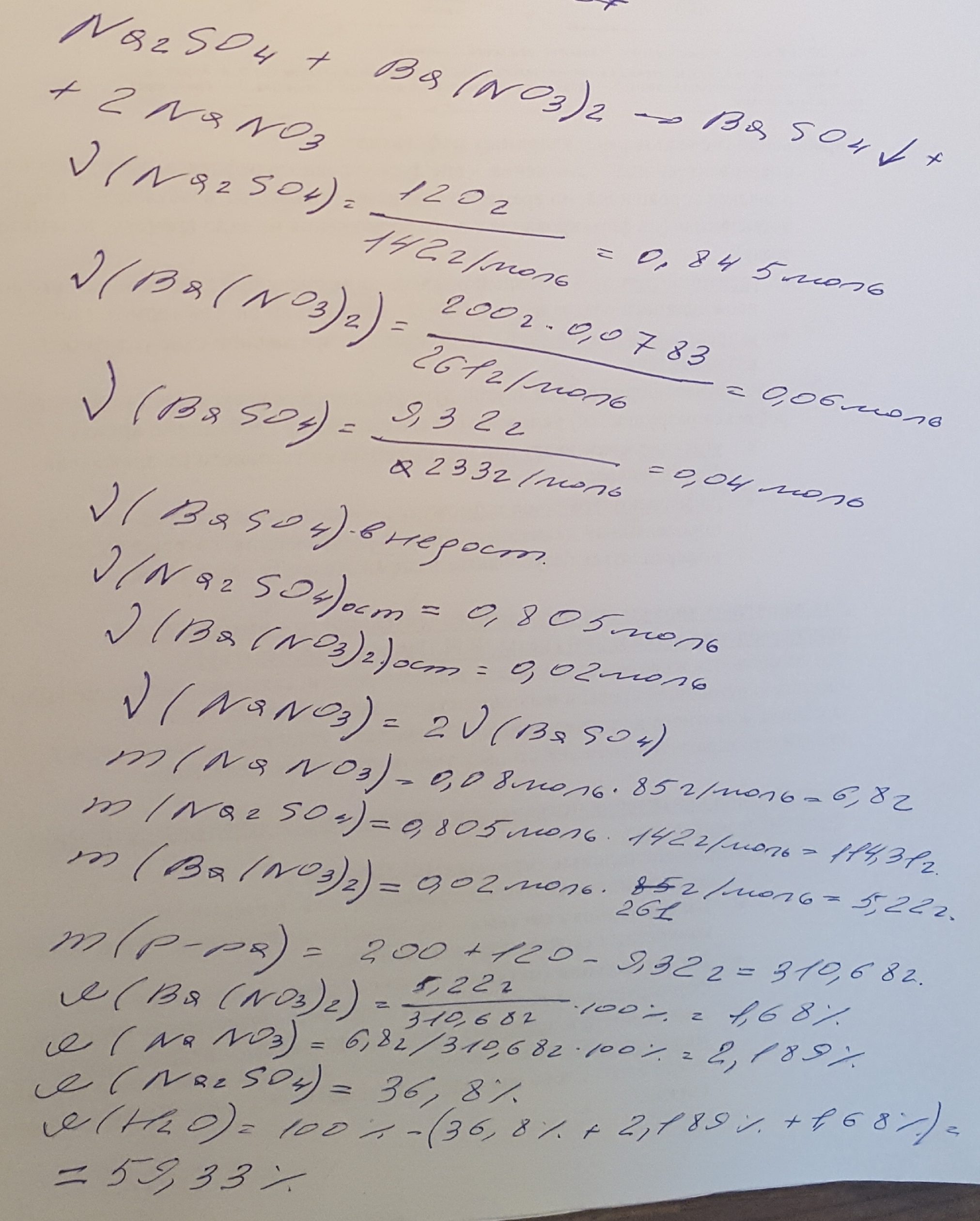 К раствору сульфата натрия массой 120 г добавили избыток раствора нитрата бария массой 200 г с массовой долей вещества 7,83%. При этом образовался осадок массой 9,32 г. Найдите массовые доли веществ в образовавшемся растворе