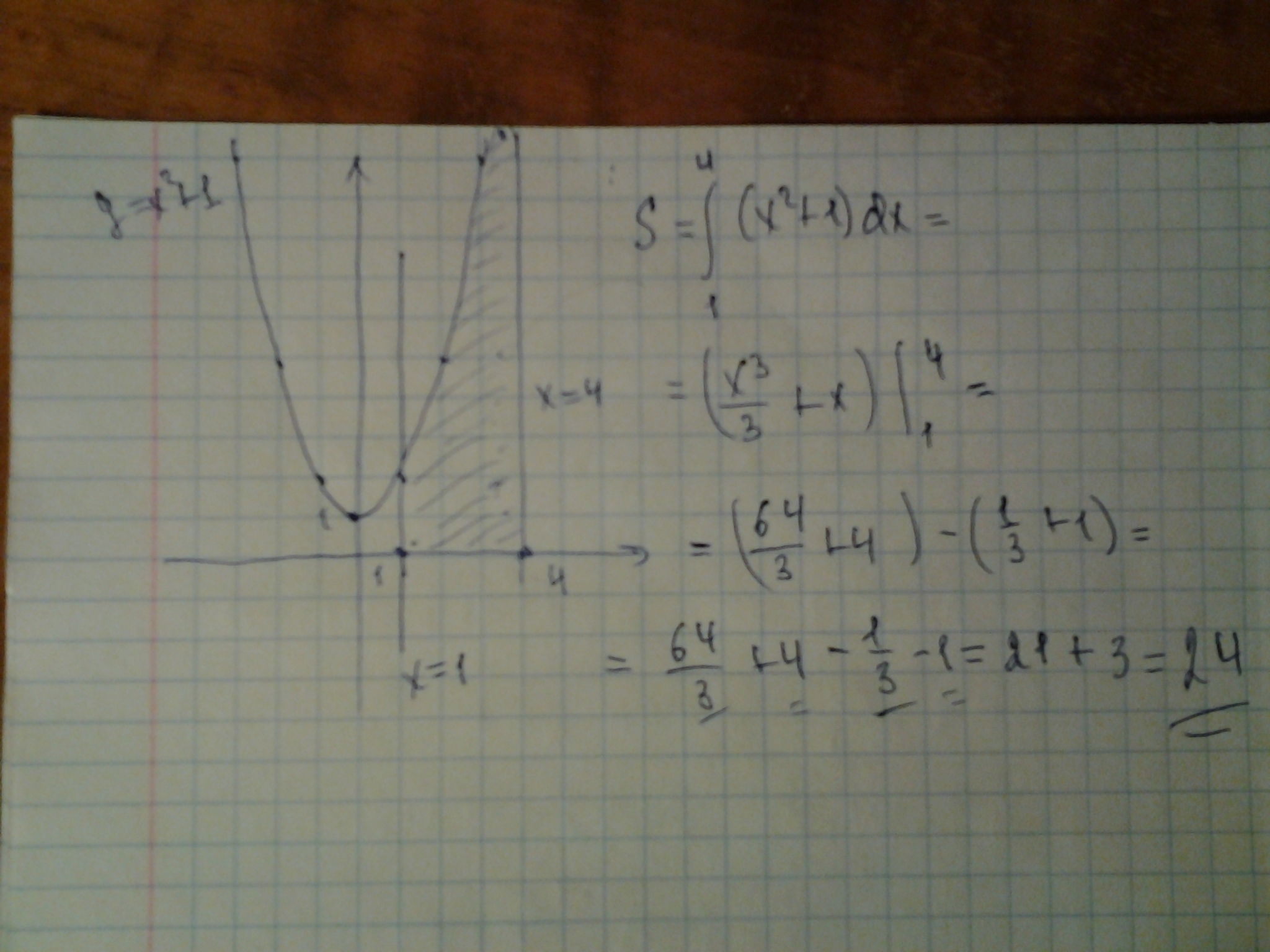 вычислите площадь фигуры ограниченной линиями y=x^2+1 x=1 x=4 y=0