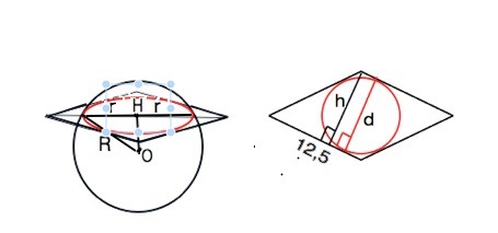 На шар, радиус которого 10 см, наложен ромб так, что каждая сторона его, равная 12,5 см, касается шара. Плоскость ромба удалена от центра шара на 8 см. Найдите площадь ромба.