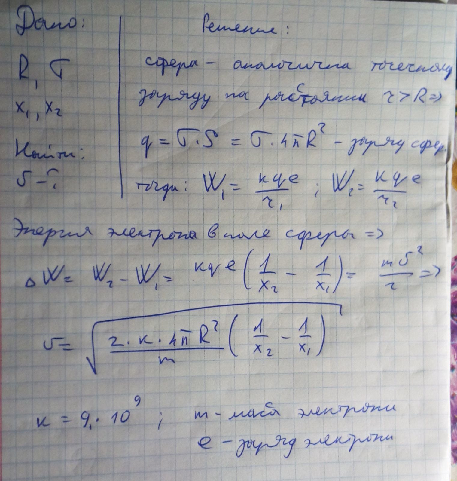 Электрическое поле образовано положительно заряженной сферой радиусом R см, поверхностная плотность заряда "сигма". Какую скорость получит электрон приблизившись к сфере с расстояния x1 до x2 по поверхности?