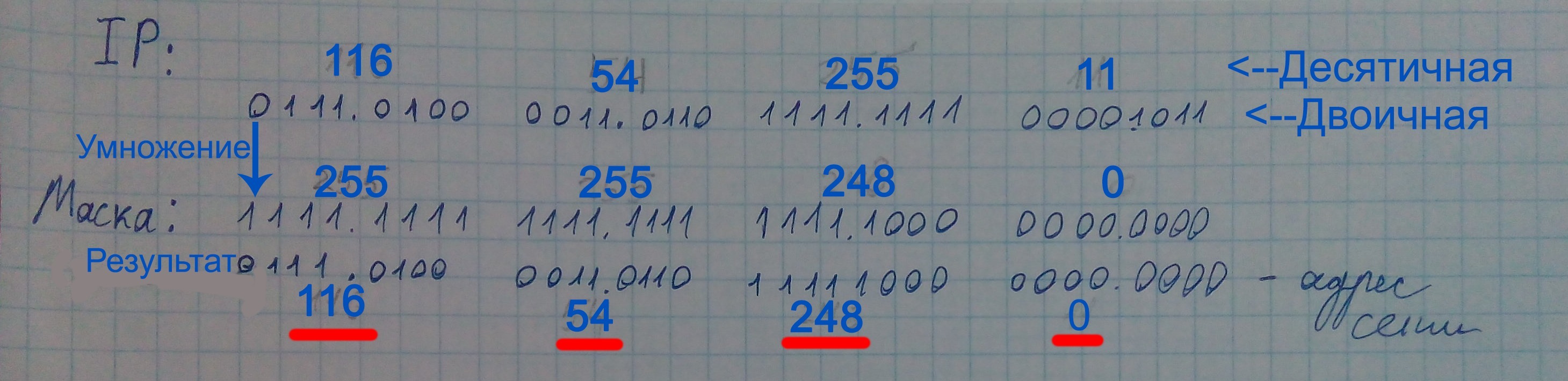 Так как последний байт маски равен нулю, находим последний байт адреса сети: 116.54.x.0