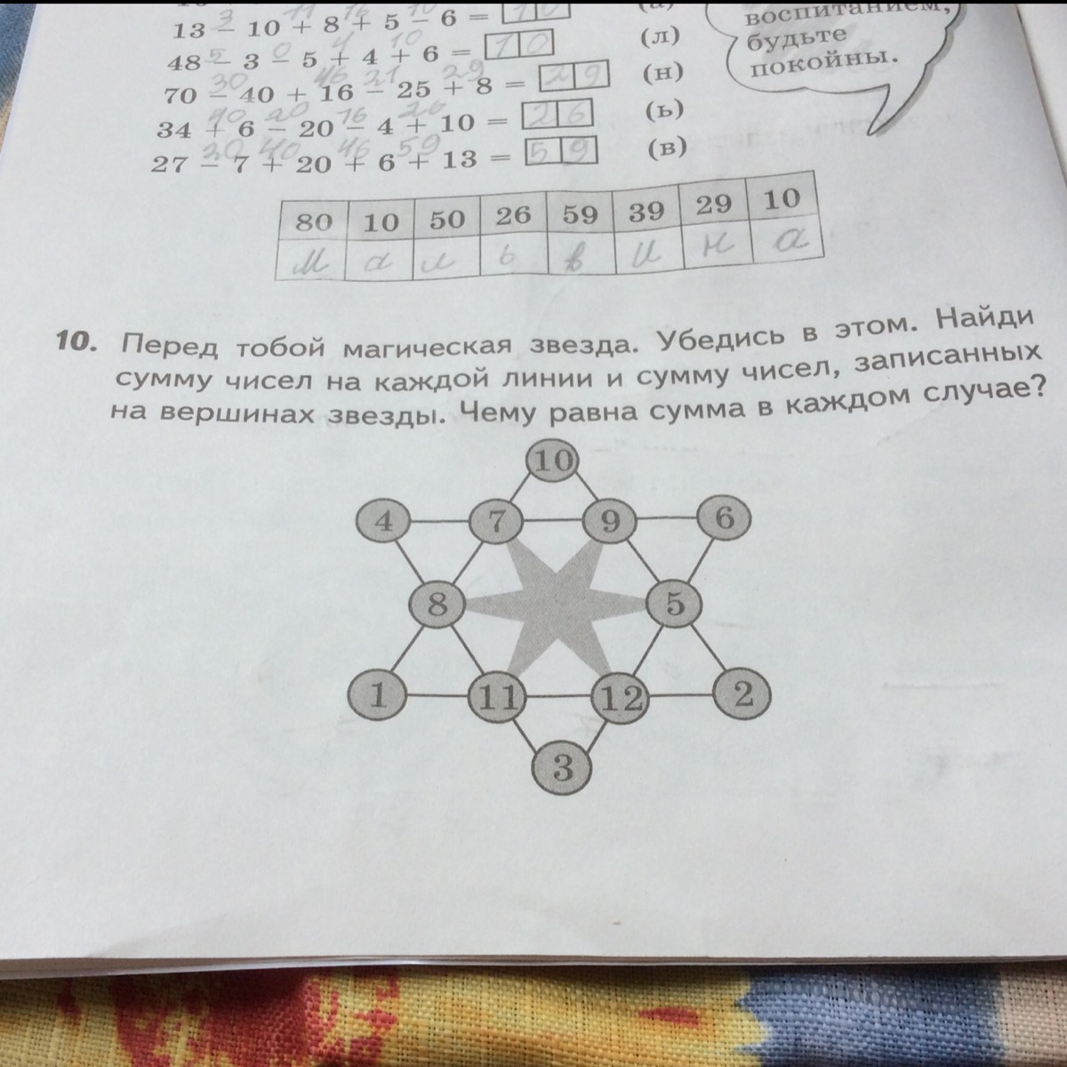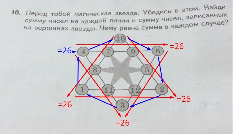 Перед тобой магическая звезда.Убедись в этом.Найди сумму чисел на каждой линии и сумму чисел записанных на вершинах звезды.Чему равна сумма в каждом случае?