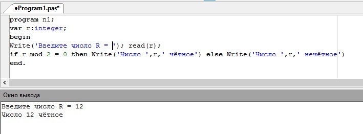 Программа на скрине, чётное число это такое число которое делится без остатка на два, в паскаль чтобы определить остаток от числа нужно использовать mod