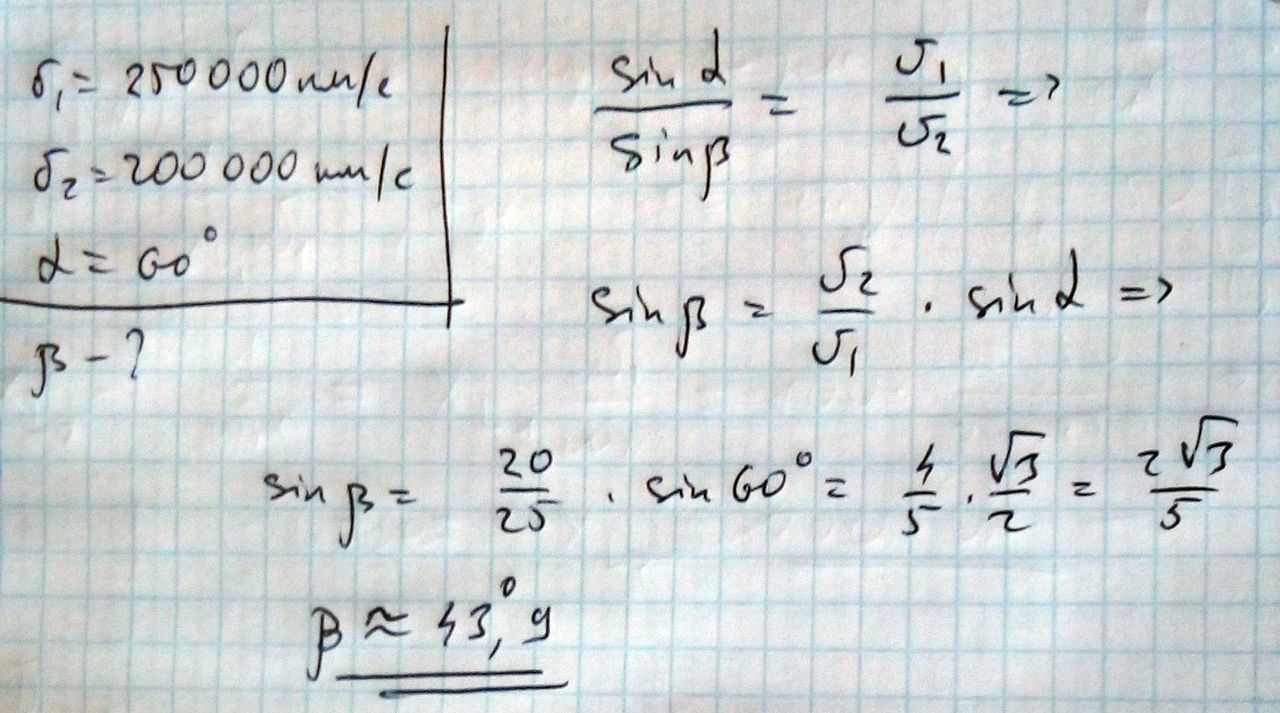 Скорость распространения света в первой среде 250000 км/c, а во второй-200000 км/c. Луч света падает на поверхность раздела этих сред под углом 60 0 и переходит во вторую среду. Определите угол преломления луча