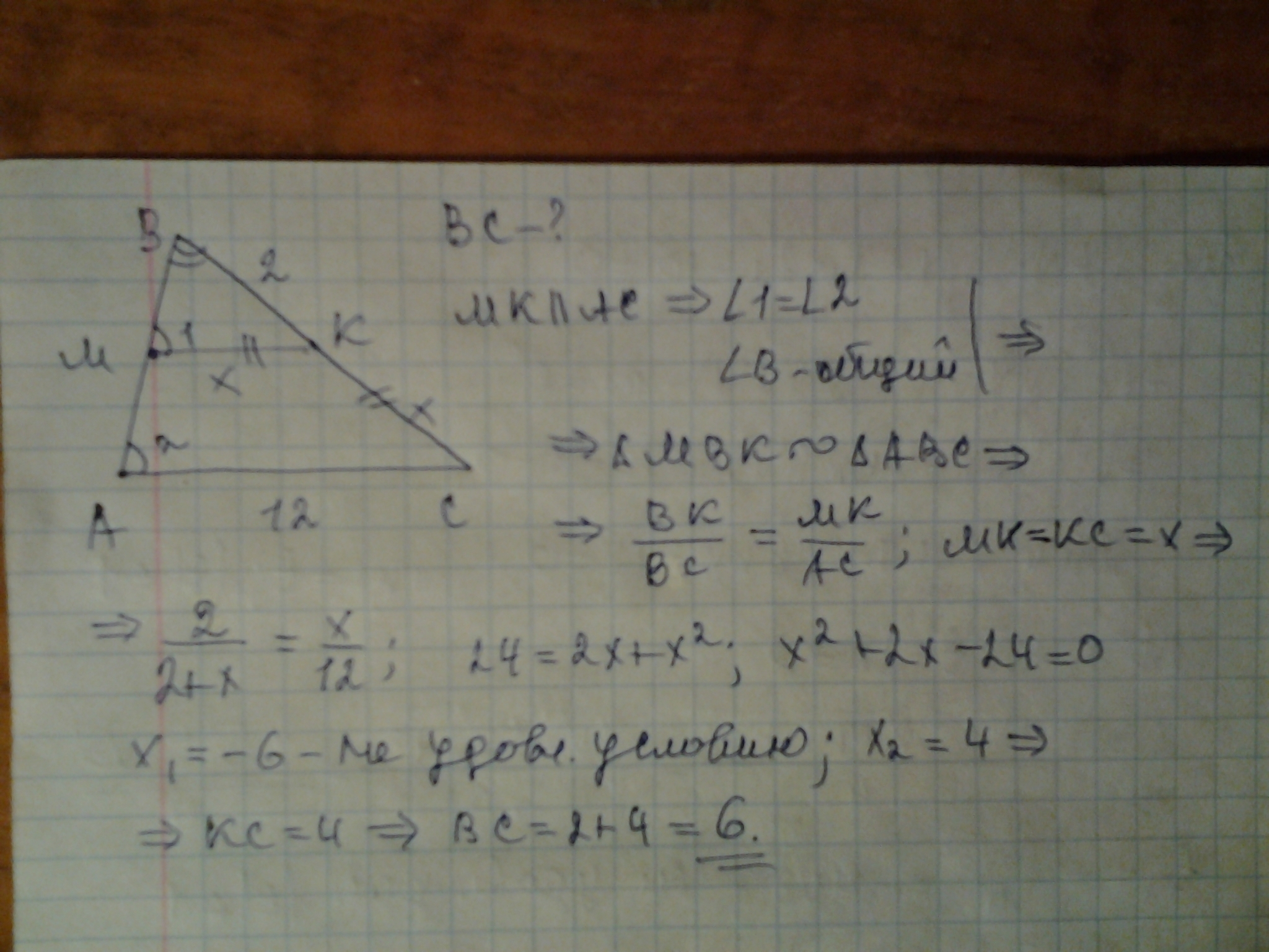Пряма, яка паралельна стороні АС трикутника АВС, перетинає його сторону АВ у точці М, а сторону ВС - у точці К. ВК=2 см, АС=12 см, МК=КС. Знайдіть ВС.