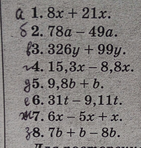1) 29x 2) 29a 3) 425y 4) 24,1y 5)10,8b 6) 22,89t 7) 2x 8) 0