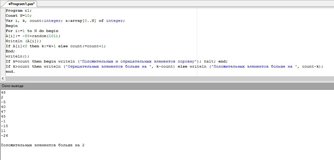 Вся программа и результат её действия на скрине. Рандомные числа я поставил из интервала -50..50, на вывод поставил 2 условия, в одном если положительных и отрицательных элементов поровну то программа выводит сообщение что элементов поровну и останавливается условием halt, если же положительных или отрицательных элементов больше то программа выводит каких элементов больше и на сколько