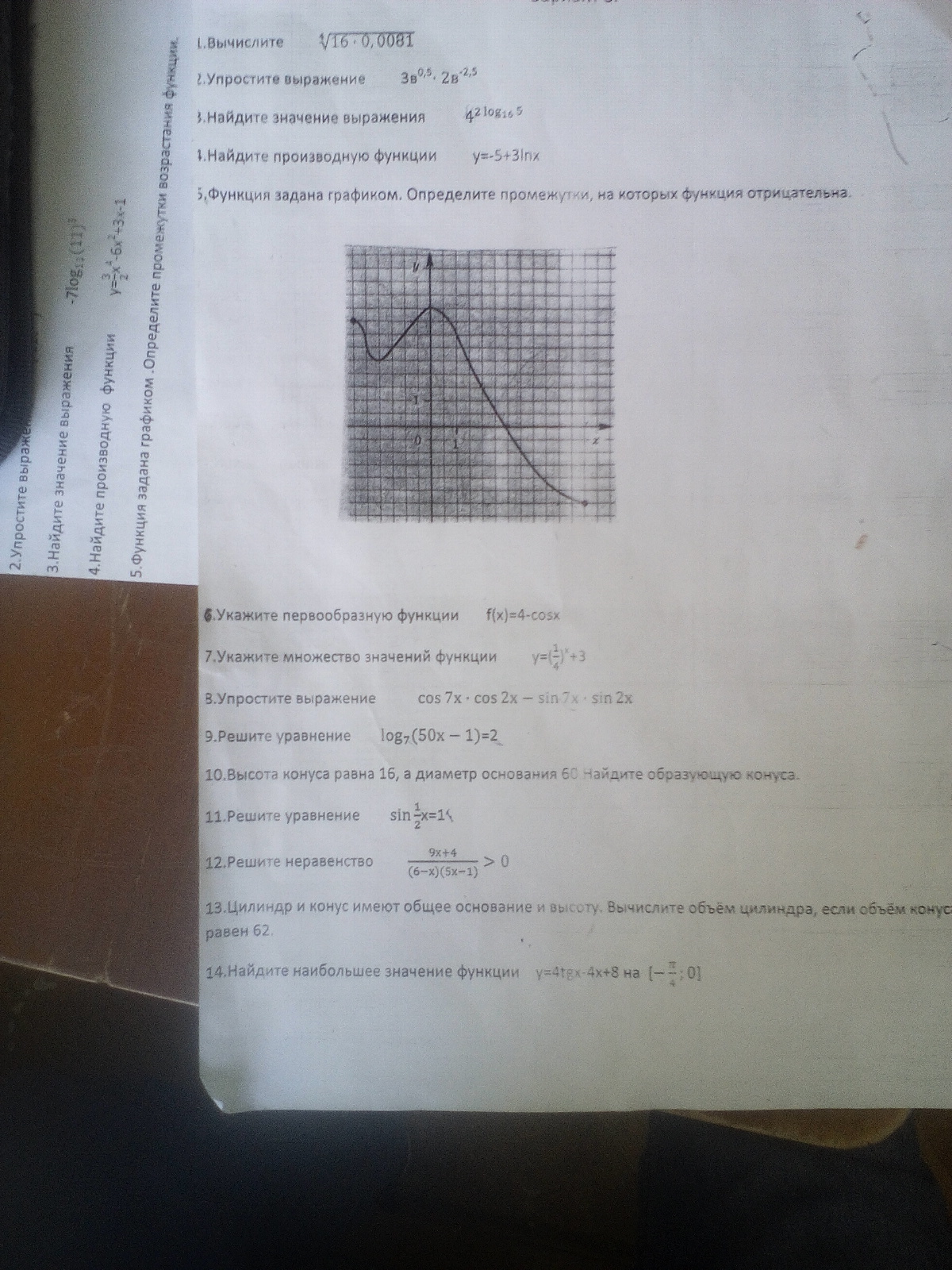 1); ; 3b^{0,5}cdot 2b^{-2,5}=6cdot b^{0,5-2,5}=6b^{-2}=frac{6}{b^2} \\2); ; cos7xcdot cos2x-sin7xcdot sin2x=cos(7x+2x)=cos9x\\3); ; sinfrac{1}{2}x=1\\frac{1}{2}x=frac{pi}{2}+pi n,; nin Z\\x=pi +2pi n,; nin Z\\4); ; f(x)=4-cosx; ; to ; ; F(x)+int (4-cosx)dx=4x-sinx+C
