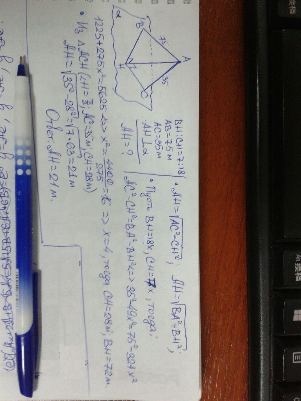 Из точки к плоскости проведем перпендикуляр и две наклонные. Длины наклонных равны 35м и 75м. Проекции наклонных на плоскость относятся как 7:18. Найти длину перпендикуляра