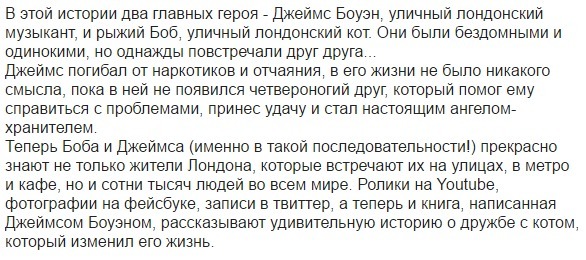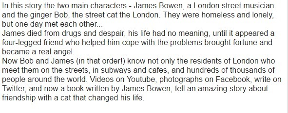 Напишите небольшой рассказ о книге "Уличный кот по имени боб" на английском.Желательно с переводом а русский
