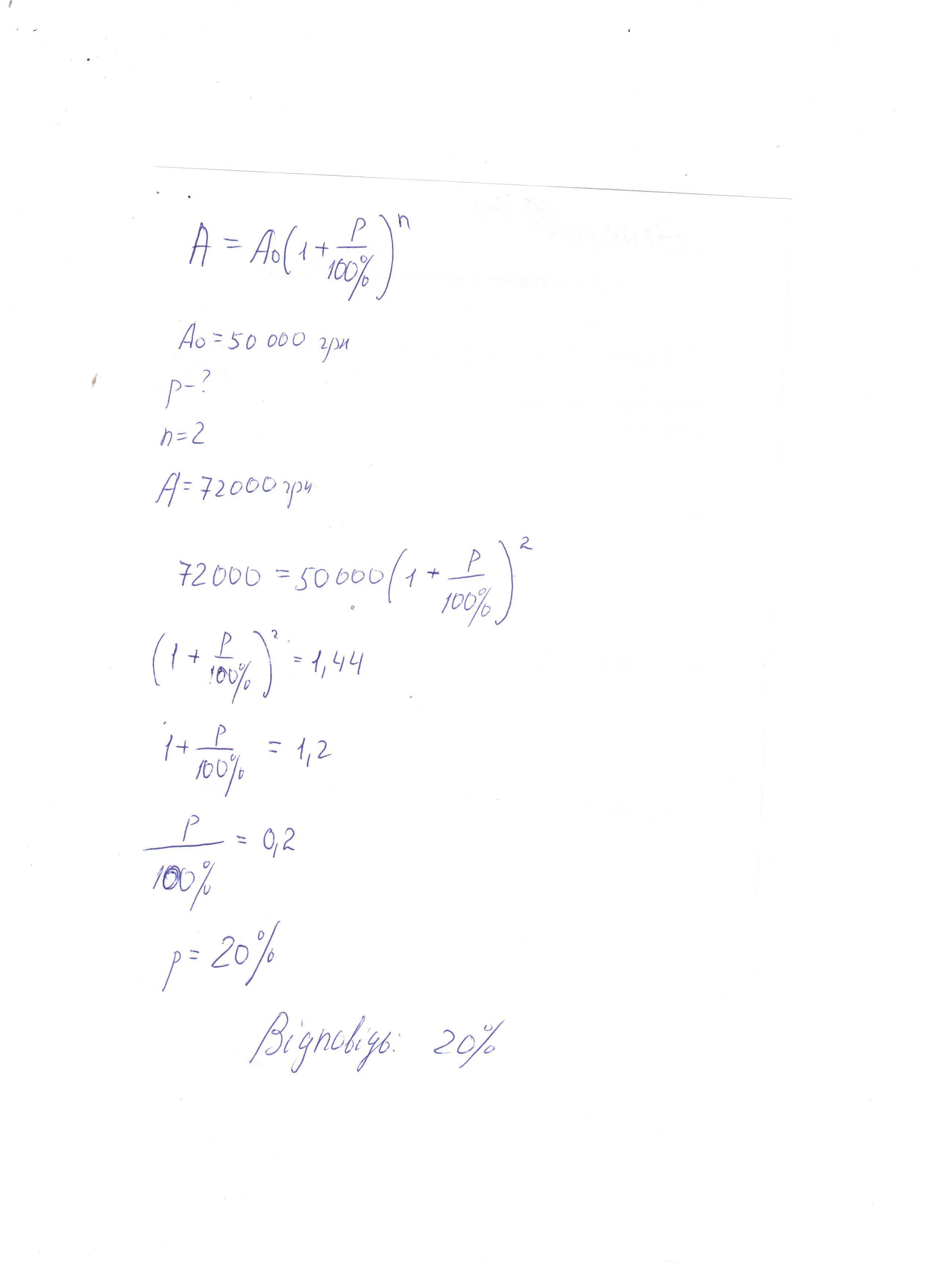 Вкладник поклав у банк 50 000 грн під деякий відсоток річних. Через два роки на його рахунку стало 72 000 грн. Під який відсоток річних він поклав гроші в банк?