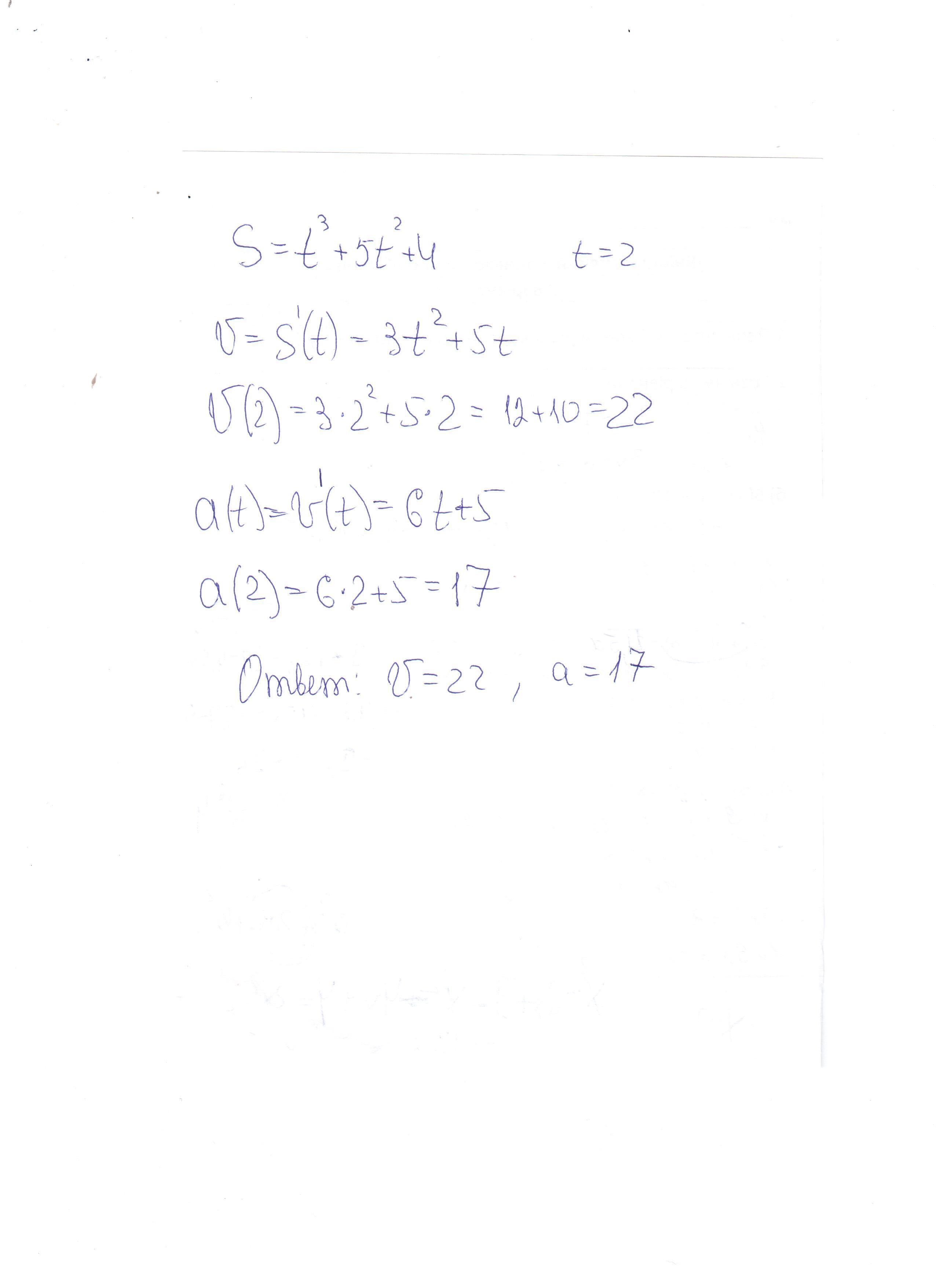 Найти скорость и ускорение в момент времени для точки, движущейся прямолинейно, если движение точки задано уравнением:S=t^3+5t^2+4 при t=2