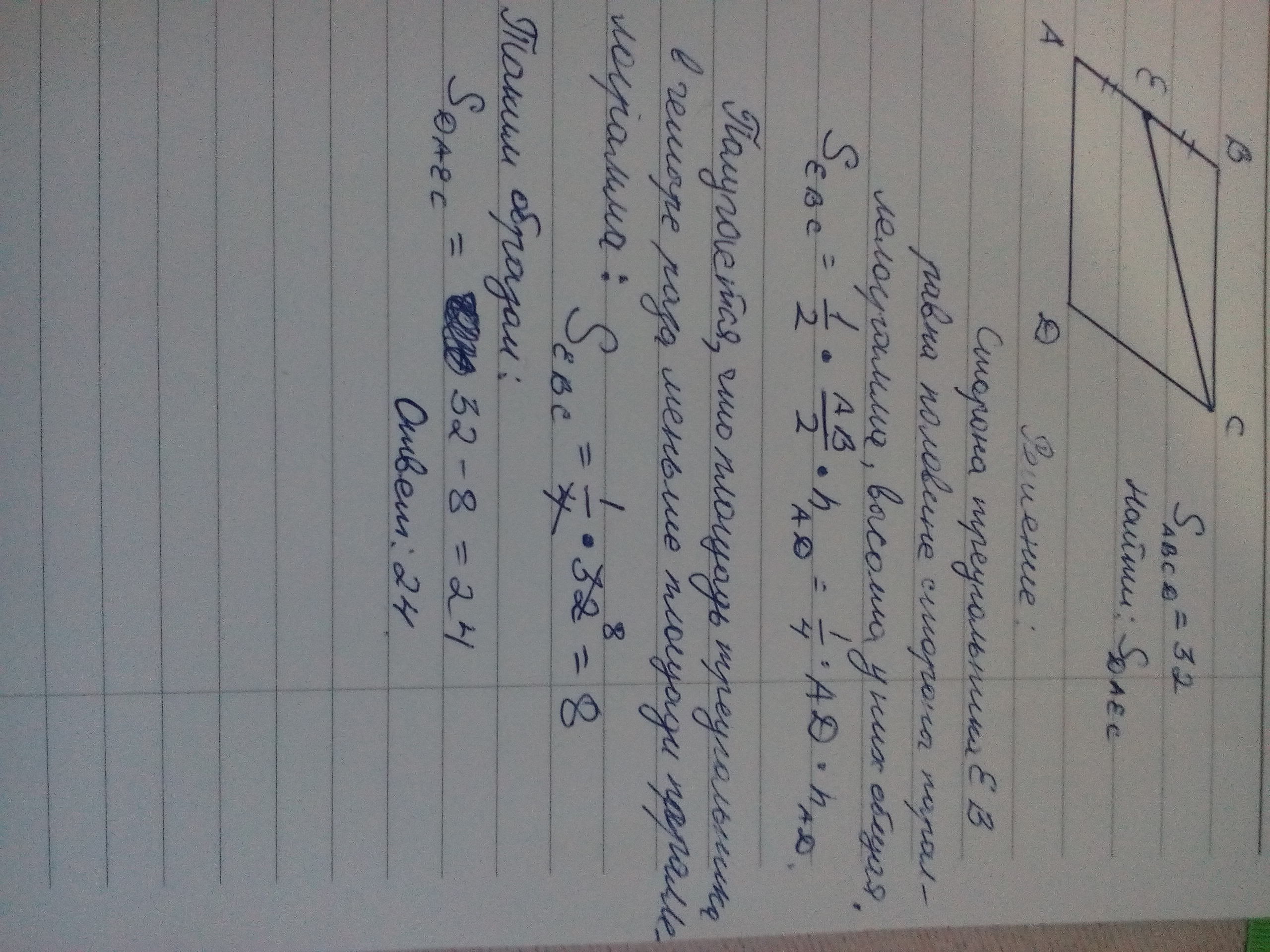 Площадь параллелограмма ABCD равна 32. Точка E- середина стороны AB.Найдите площадь трапеции DAEC