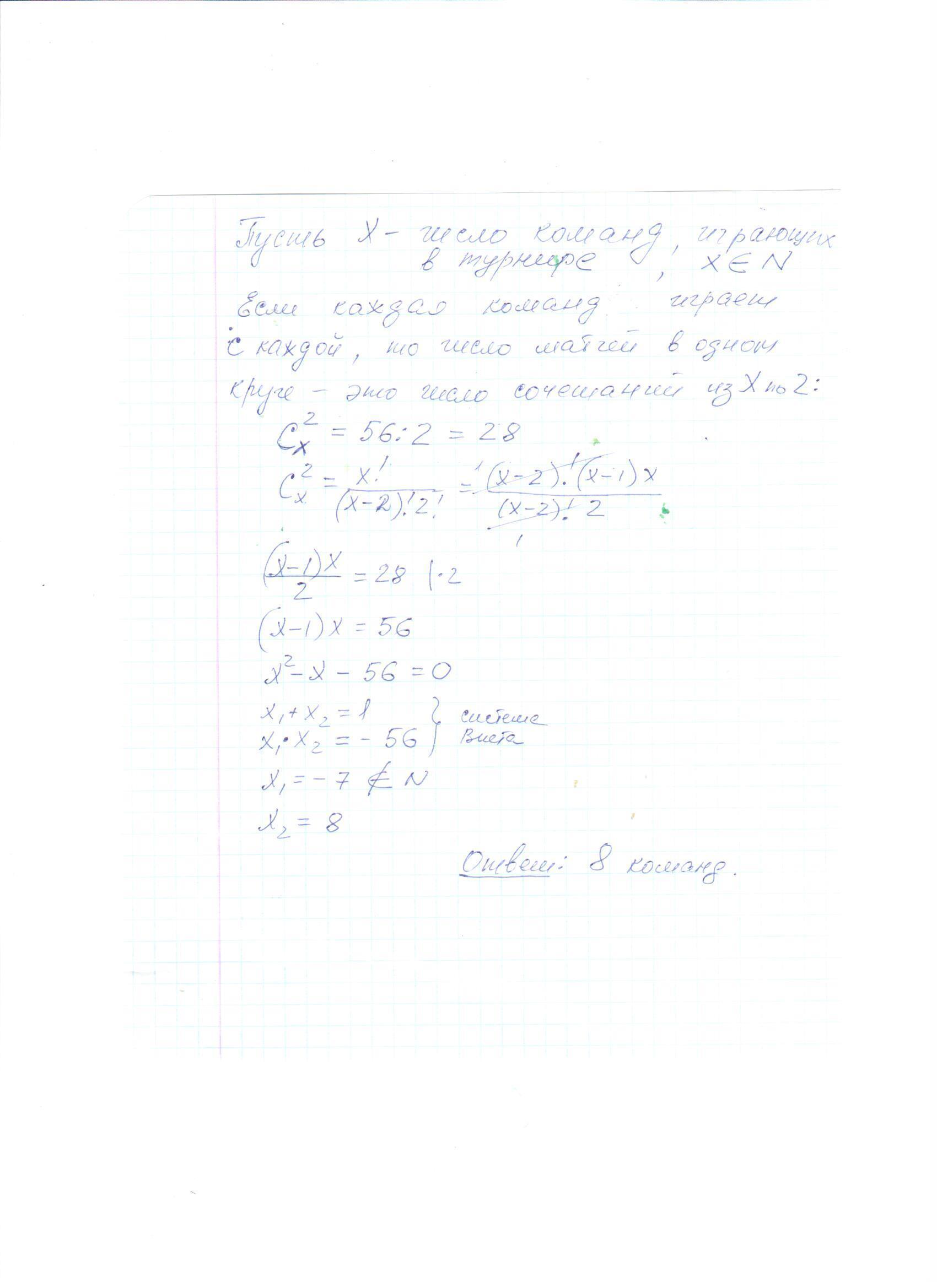 в двухкруговом турнире было сыграно 56 матчей. сколько участвовало команд, если в каждом круге каждая команда играет с каждой по одному матчу.