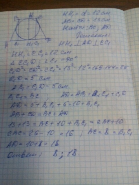 Около окружности диаметром 12 см описан равнобокая трапеция. Длина боковой стороны трапеций 13 см. Найдите основание этой трапеций! За правильный ответ 30 баллов!