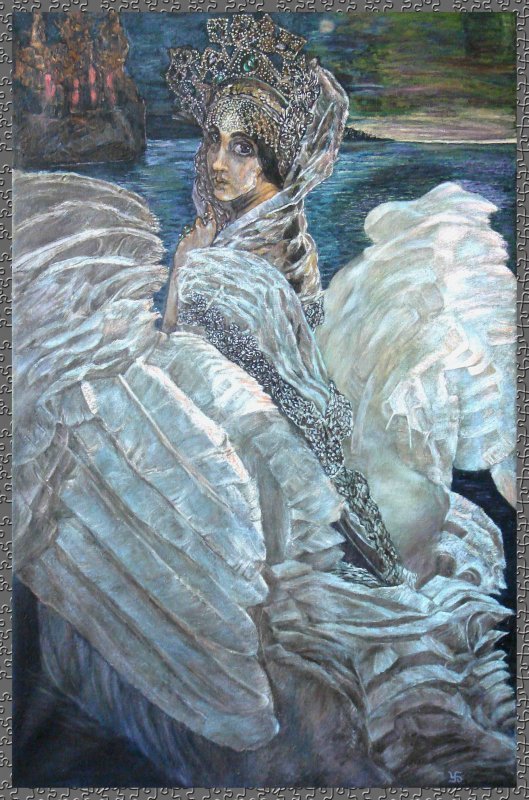Вспомните Царевну Лебедь из сказки А.С.Пушкина. Что сближает эти образы? Когда описывают птицу-лебедя, обычно говорят "он". Белый лебедь, черный лебедь. Но Заболоцкий говорит, что его лебедь - "она". Причем он явно намекает, что эта та самая Царевна-Лебедь, о которой писал А.С.Пушкин в "Сказке о царе Салтане". ("Глядь — поверх текучих вод лебедь белая плывет"). И мантия, и сияние, и мерцание глаз, подобное аметистам – это описание напоминает «Царевну-Лебедь с полотна М.А. Врубеля.
