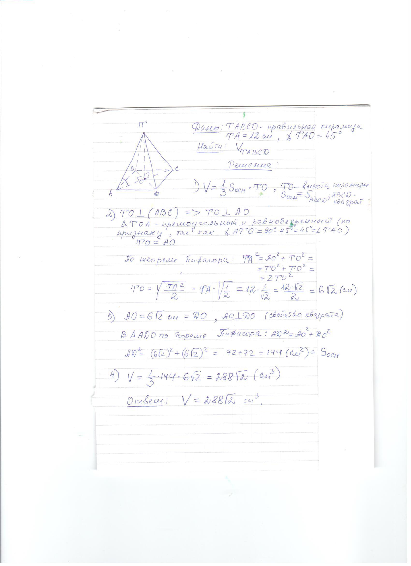 Боковое ребро правильной четырехугольной пирамиды равно 12 см и составляет угол 45 градусов с плоскостью основания. Найдите объём пирамиды.