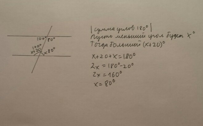 Найдите углы, образованные при пересечении двух параллельных прямых третьей прямой, если один из внутренних односторонних углов на 20° меньше второго.