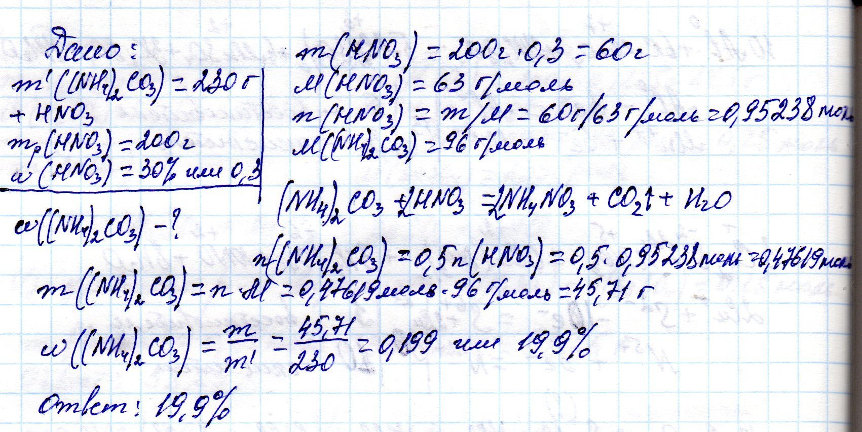 найти массовую долю чистого вещества в техническом карбонате аммония массой 230г, если он реагирует с азотнной кислотой, масса раствора который 200г, а её массовая доля в растворе 30%.