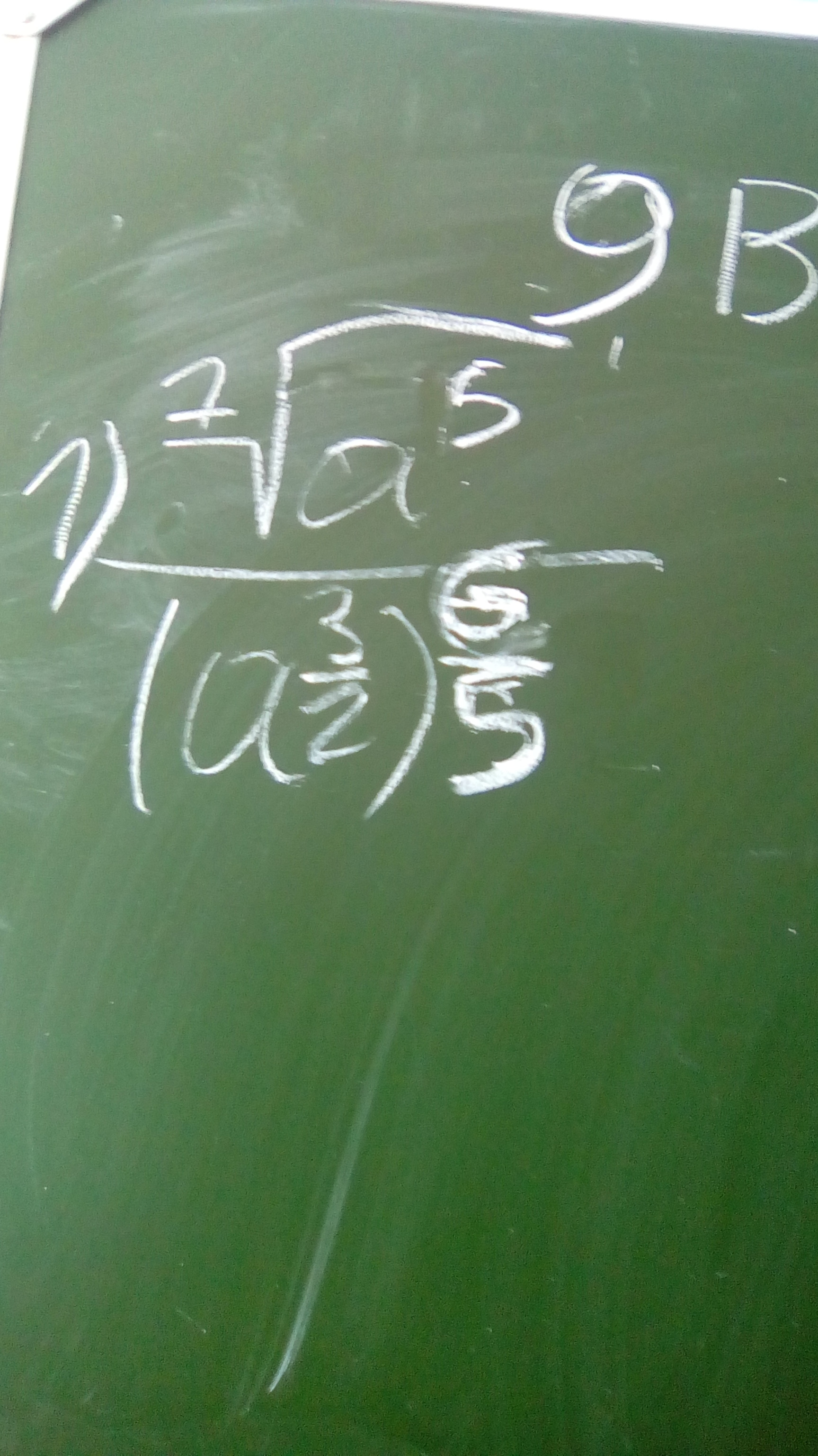 frac{ sqrt[7]{a^{5}} }{(a^{ frac{3}{2} })^{ frac{6}{5}} } = frac{a^{ frac{5}{7}} }{a^{ frac{3}{2} * frac{6}{5}} } = frac{a^{ frac{5}{7}} }{a^{ frac{9}{5} }} =a^{ frac{5}{7} - frac{9}{5} }=a^{ frac{25}{35}- frac{63}{35} }=a^{- frac{38}{35} } = (frac{1}{a} )^{1 frac{3}{35}  }