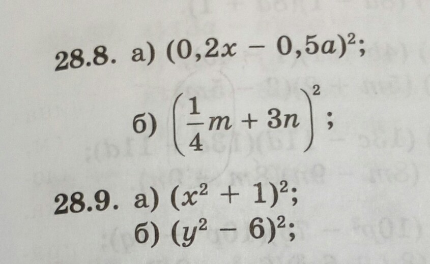 28.8 б) (1/4m+3n)²=1/16m²+1,5mn+9n²( По ФСУ a²+b²=a²+2ab+b² )