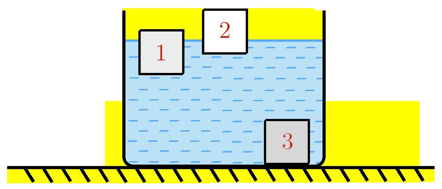 2)В сосуде с водой находятся три тела, которые в равновесии располагаются так, как показано на рисунке. Тела сделаны из разных материалов, но имеют одинаковые размеры. На какое из тел действует наименьшая выталкивающая сила?