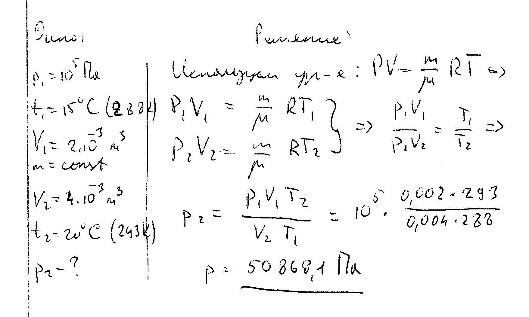 При давлении 10^(5) Па и температуре 15 °С воздух имеет объем 2 • 10^(–3) м(3). При каком давлении данная масса воздуха займет объем 4 • 10^(-3) м (3), если температура его станет 20°С?