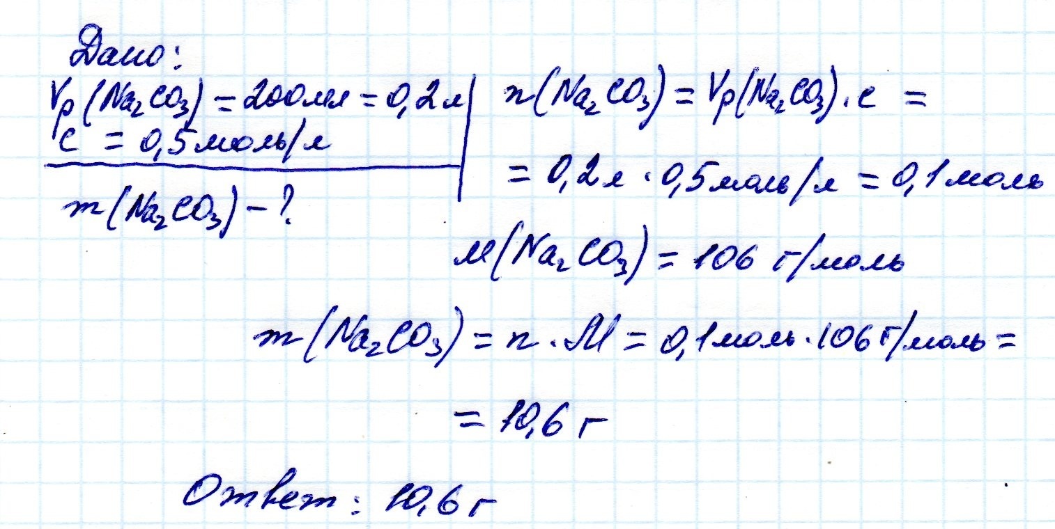 Какую массу карбоната натрия нужно взять для приготовления раствора V (р-ра) 200 мл, С- 0.5 моль/л)?
