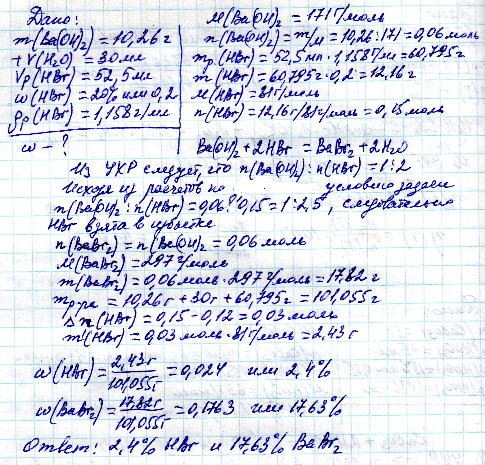 к гидрооксиду бария массой 10,26 г добавили 30 мл воды, а затем 52,5 мл 20%- го раствора бромводородной кислоты (р-1.158г/мл). Вычислите массовые доли веществ в растворе.
