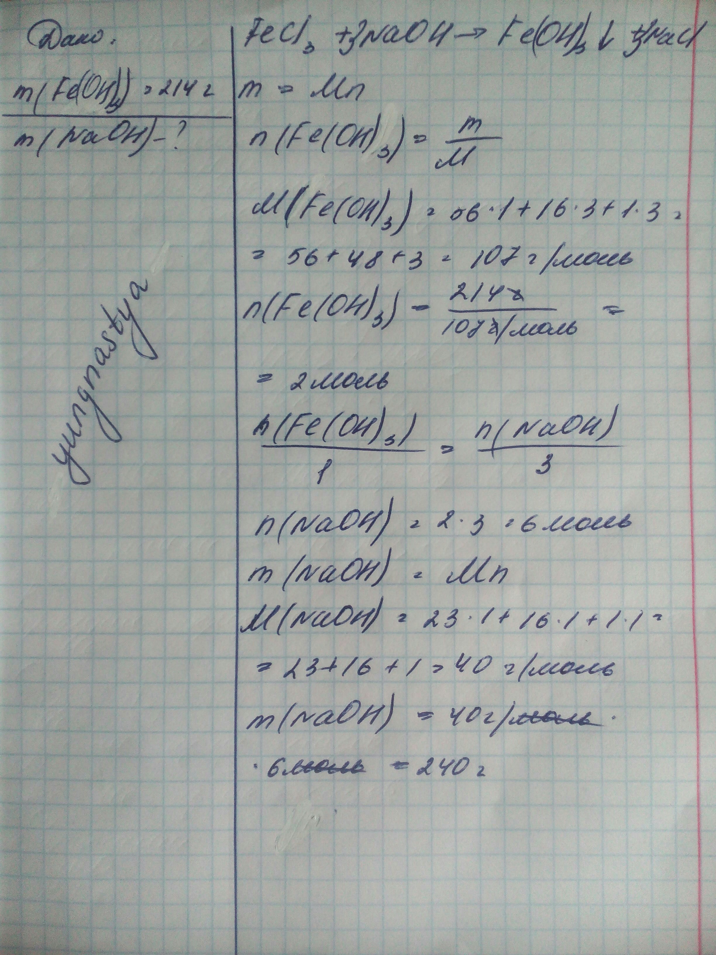 Какую массу гидроксида натрия нужно взять для реакции нейтрализации с хлоридом железа (III), чтобы получить 214 грамм гидроксида железа (III).