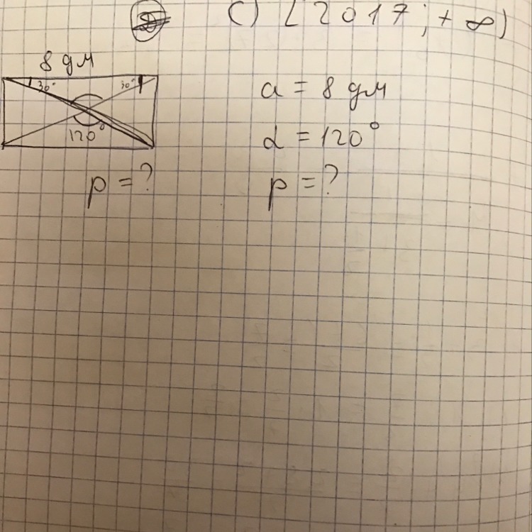 Найдите периметр четыреxугольника длина которого равна 8 дм, его диогонали пересекаются создовая угол в 120 гоадусов.