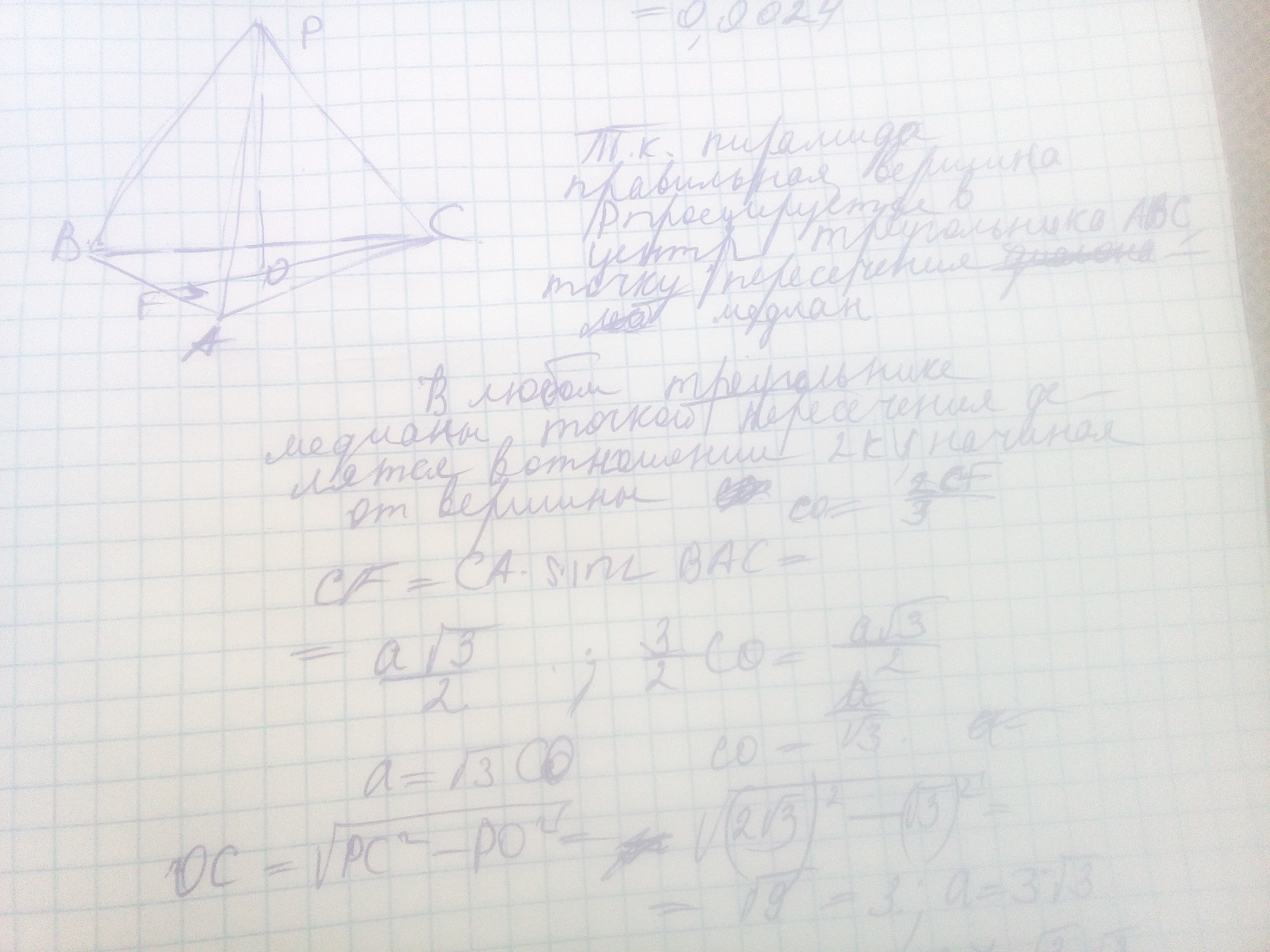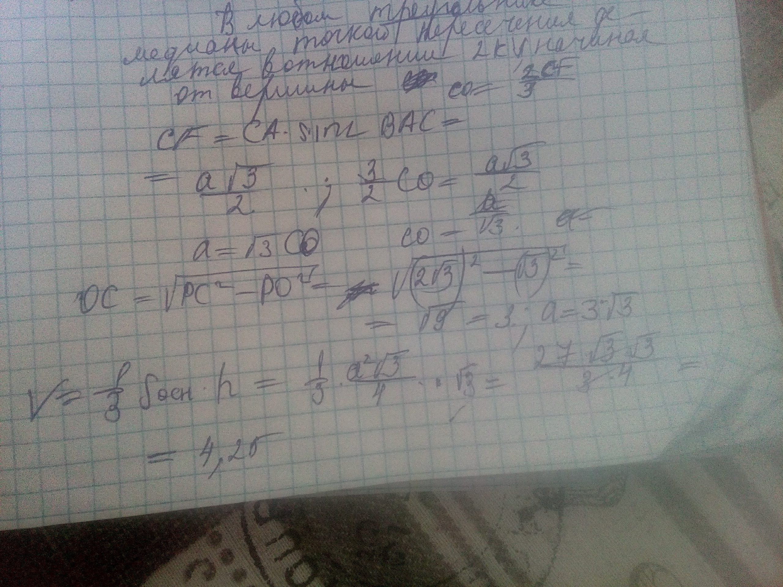 В правильной треугольной пирамиде боковое ребро равно 2√3 см. а высота √(3 )см. Найдите объем пирамиды.