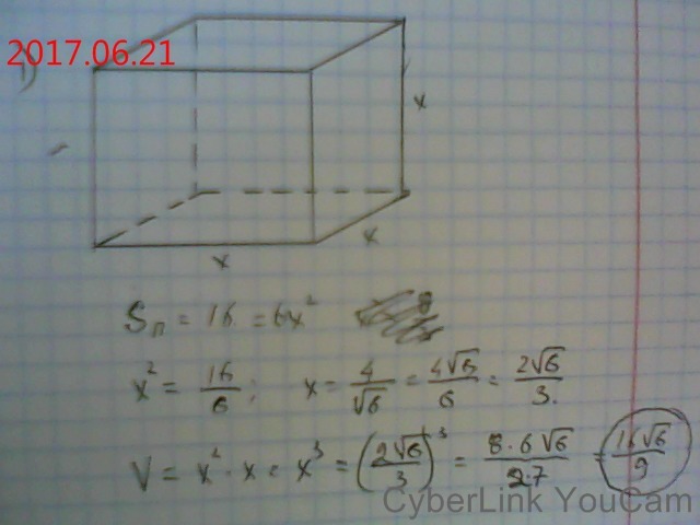 1) ребро куба х. Площадь одной грани равна х² см². Площадь полной поверхности равна площади 6-ти граней, S=6х²=16 по условию.