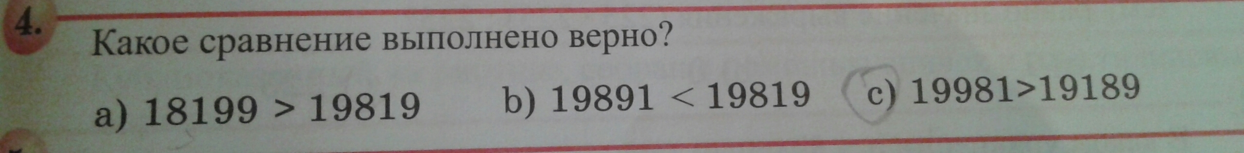 какое сравнение выполнено верно? а) 18199> 19819 б) 19891 < 19819 с) 19981 > 19189