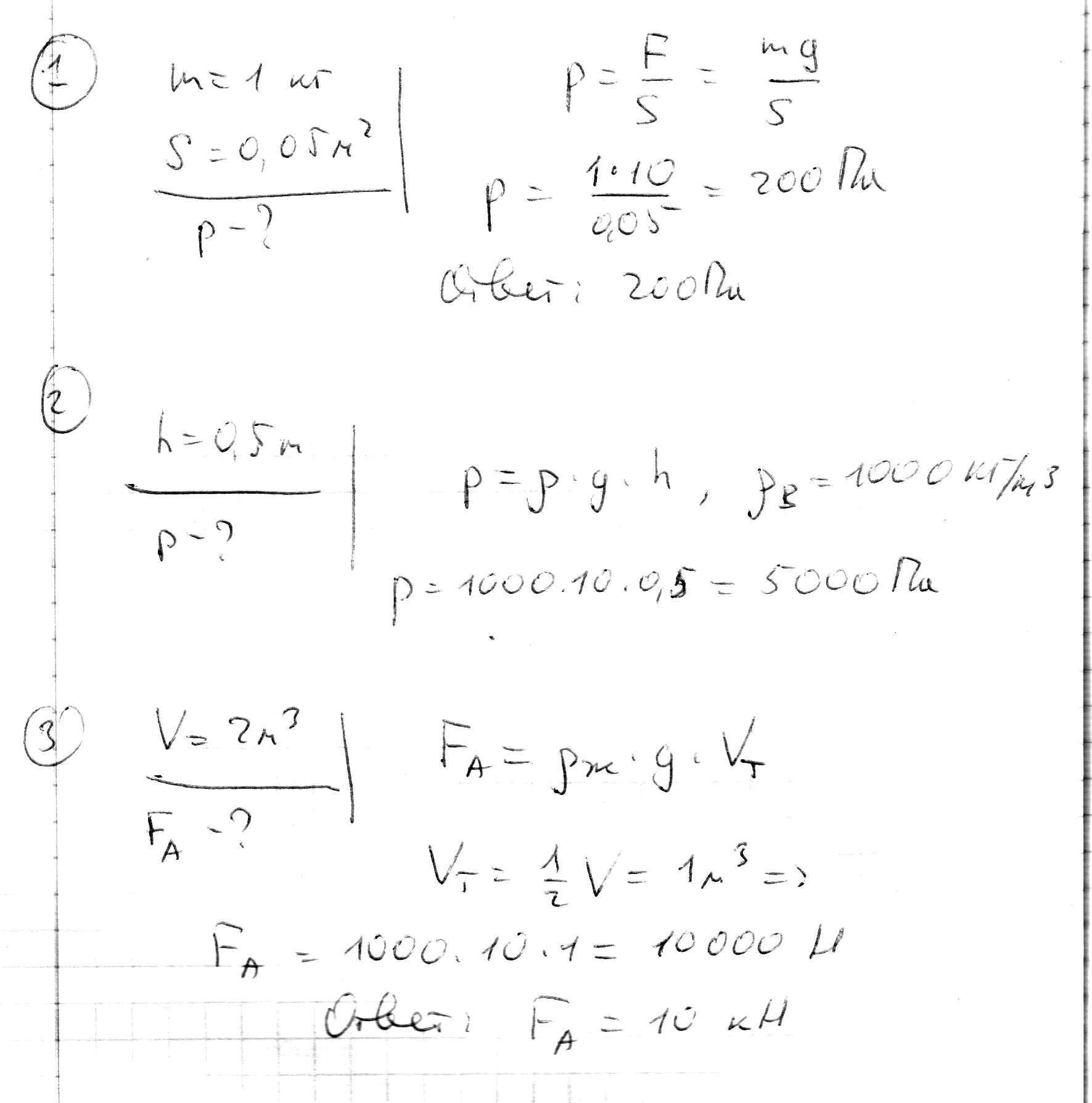p=(1кг·10Н/кг)/0,05м²=5000(Па)=5кПА