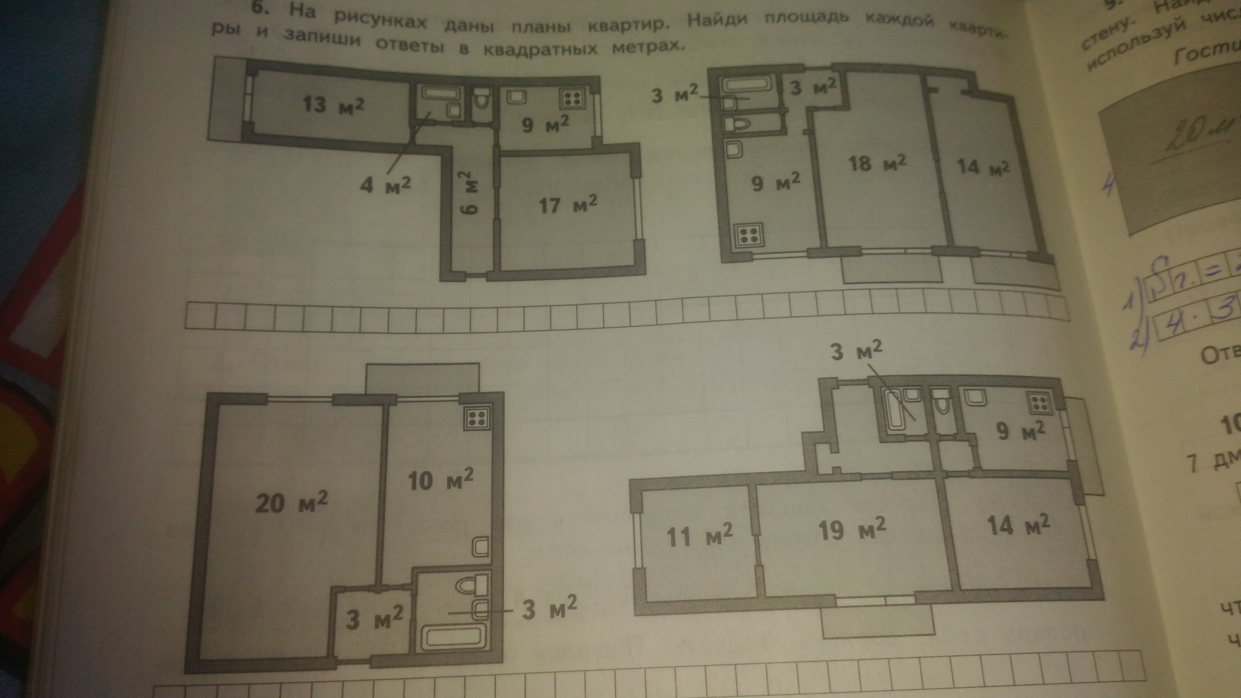 На рисунках даны планы квартир. Найди площадь каждой квартиры ответь в квадратных метрах