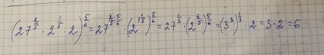 =((27^(2/5))^(5/6)*(2^(1/5))^(5/6)*2^(5/6)=27^(1/3)*2^(1/6)*2^(5/6)=3*2=6