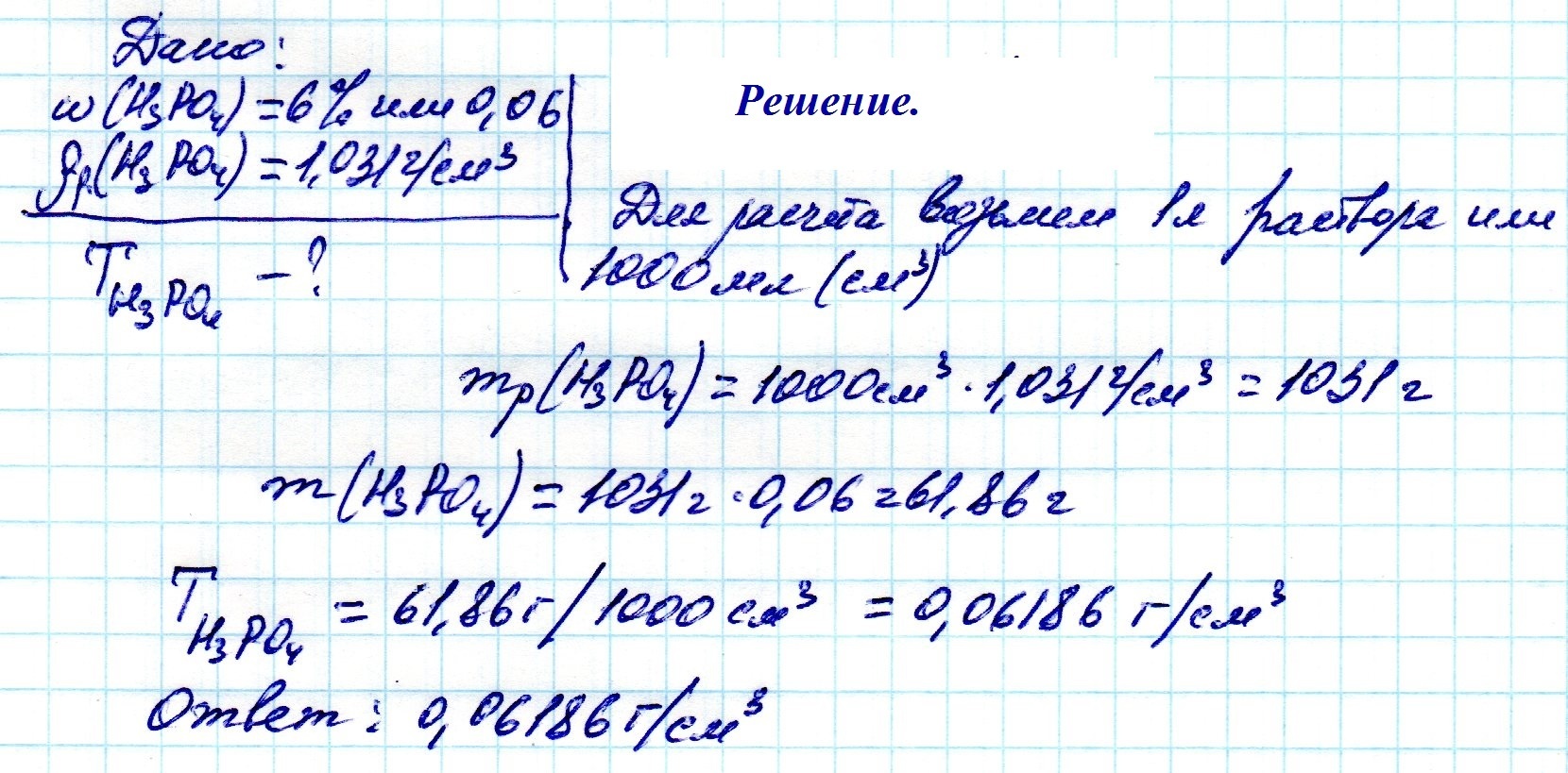 Решите пожалуйста подробно задачу по химии. Чему равен титр 6%-го раствора H3PO4, если его плотность 1,031 г/см^3?