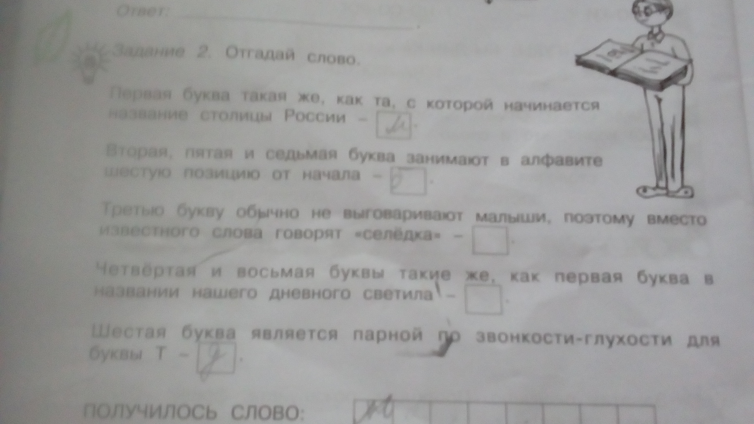 Первая буква такая же, как та, с которой начинается название столицы России. Столица России - это Москва, значит первой буквой является буква М.